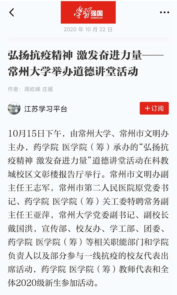 | 学习强国:弘扬抗疫精神 激发奋进力量——常州大学举办道德讲堂活动 |