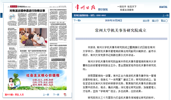 本报讯 常州大学机关事务研究院成立暨揭牌仪式日前在常州大学举行。国家机关事务管理局政策法规司副司长鲍轶欣、副市长杨芬、常州大学党委书记陈群出席仪式并讲话。 常州大学机关事务研究院由常州市机关事务管理局和常州大学瞿秋白政府管理学院联合主办,是全国首家地市级机关事务研究机构。 按照国管局统一部署,常州正全力推进机关事务集中统一管理改革和标准化、信息化“一体两翼”建设工作。研究院的成立,旨在紧紧依托常州大学的科研教学优势,聚焦制约机关事务改革创新发展中的热点、难点、痛点问题,深化理论研究创新,加强管理人才培养,坚持“学研用”结合,多出成果、出好成果。 研究院将从三个方面努力打造机关事务领域理论研究的标杆,即聚焦重点领域打造思想阵地,服务地方需求打造智库高地,培养创新人才打造教育基地,推动常州机关事务高质量发展走在全国全省前列。 常州日报:http://epaper.cz001.com.cn/site1/czrb/html/2020-10/26/content_368633.htm |