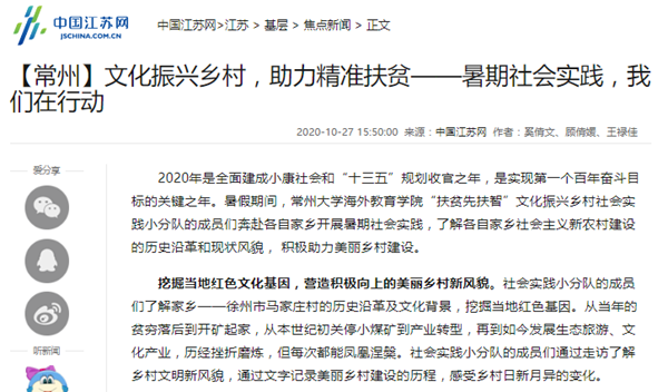 | 中国江苏网:【常州】文化振兴乡村,助力精准扶贫——暑期社会实践,我们在行动 |