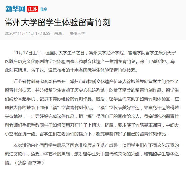 | 新华网:常州大学留学生体验留青竹刻 |