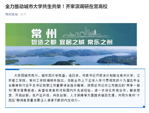 | 常州发布:全力推动城市大学共生共荣!齐家滨调研在常高校 |