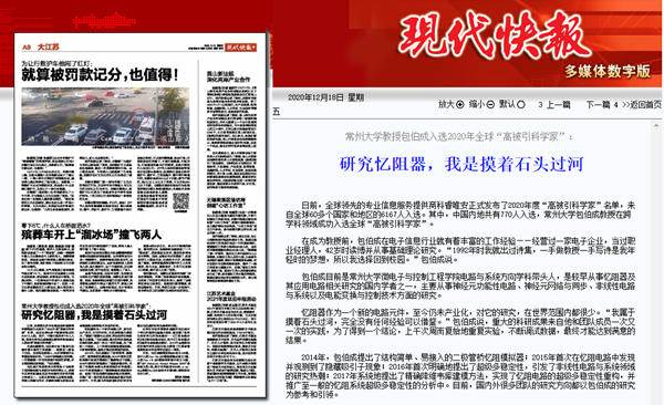 | 现代快报:常州大学教授包伯成入选2020年全球“高被引科学家” |
