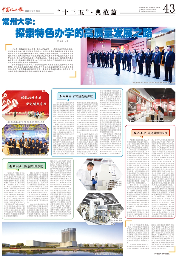 1978年,伴随改革开放的脚步,常州大学的前身——南京化工学院无锡分院、常州分院分别在无锡、常州两地应运而生。这所以服务国家改革开放重大项目和地方石化产业发展为初心的本科院校,在时代浪潮中扬帆起航。沐浴着中国石油化工行业以及江苏地方经济跨越发展的春风,伴随着实现中华民族伟大复兴中国梦的进程,常州大学逐渐从草创时的幼苗成长为一棵参天大树。纵观其朝气蓬勃的发展过程,石油石化、创新创业、红色文化三大办学特色不断彰显,且彼此融合,正成为这所高等院校鲜明独特的烙印。 常州大学党委书记陈群说:“当前常州大学正处在继往开来、乘势而上的大好时期。学校通过立足地方、服务行业、面向国际以及与之融荣与共的战略合作与互动,加强内涵式建设,推进高质量发展。全体师生员工凝心聚力,锐意创新,为全面建成特色鲜明的高水平地方领军型大学而努力奋斗。” 石油石化 产教融合的深度 作为江苏省人民政府与中国石油天然气集团有限公司、中国石油化工集团有限公司及中国海洋石油集团有限公司共建的省属全日制本科院校,常州大学因石油石化而建,因石油石化而兴。40多年来,常州大学为中国石油石化行业培养和输送了例如十九届中央候补委员,中国石油天然气集团有限公司董事长、党委书记,中国工程院院士戴厚良,中国第一汽车集团有限公司董事长、党委书记徐留平等众多石油石化行业领军人才,更有一大批毕业生在中石化、中石油、中海油系统成为骨干。石油石化特色已成为常州大学的核心竞争力。 依托优势学科,赋能行业转型升级。近年来,常州大学突出问题导向,积极主动作为,牵头发起成立中国化工安全教育联盟,在整合教育资源、搭建平台桥梁、培养化工安全人才方面进行尝试和创新,调动高等教育、行业协会、龙头企业以及教育平台等社会主体在化工安全教育中能动性,打造互联互通、互惠互利、互学互鉴的石油石化安全人才培养的命运共同体。学校着力推动行业协会合作、拓宽地方行业服务渠道。在大庆石化、金陵石化、扬子石化等大型石化公司中,由常州大学机械学院的刘雪东教授团队研发的含油化工污泥干化热解一体化技术,有效解决了污泥残渣排放对当地生态环境带来的污染难题。该技术通过对污泥中的水进行减量,可将污泥排放的重量降低至原排放量的1/3左右,进而大大降低了石化企业的排污成本。 走出去请进来,常州大学扎实推进校企精准对接,创新合作再创新高。2020年,学校多个团队赴扬子石化、金陵石化、安庆石化、齐鲁石化、大榭石化等中石化、中海油下属企业,围绕企业生产过程中的实际问题开展了技术对接。2020年常州大学与中石化科技部及下属企业共签约项目42个,其中中石化总公司项目12个。学校专家参加在中国石油和化学工业联合会组织的全国石化化工新技术交流会、年度科技工作会、全国石油石化科技成果推广交流会等重要会议。2020年,学校获批中国石油与化工联合会石油和化工行业多元热流体稠油及非常规油气开采技术工程实验室。 2020年,常州大学各技术转移分中心走访企业600多家,进行科技服务超过800人次,有效助推中小型企业转型升级。学校在化学化工、材料、生物医药、智能制造、环境治理与资源利用、信息技术等领域形成了一批代表性科研成果,部分成果实现了产业化应用。近年来,学校获国家科技进步二等奖4项、国家技术发明二等奖1项、中国专利银奖1项,授权发明专利数稳居全国高校前50强。 有产业话语权,才能深度协同推进领军人才培养。学校通过与行政链、产业链等良性互动和同步运作,变服务为支撑,引领产业发展。截至目前,常州大学已与国内50余家大型石油石化企业和40个县区级以上政府建立了全面合作关系,与企业共建省级工程技术中心21个、校企联合研发中心42个、产学研基地429个、校企联盟396个。 创新创业 激扬奋发的热度 “学院为我们建立了专业的教师辅导团队,带领我们从书本中走出来。”常州大学石油工程学院2020届硕士毕业生刘雅莉连续4年参加石油类品牌赛事“中国石油工程设计大赛”,并获得三等奖、一等奖等。她说,这得益于学院“校内教师核心指导组+企业导师指导”的双指导模式。刘雅莉目前在中国石油大学(华东)油气田开发工程专业攻读博士研究生。从本科到研究生,刘雅莉在常大度过了7年时光,成为学院创新人才培养工程的见证人。近年来,“双指导”+“双平台”+“三级资助体系”,这种“2+2+3”人才培养模式,助力常州大学石油工程学院取得可喜成绩。据初步统计,2016~2020年,常州大学石油工程学院研究生在各类竞赛中获得国家级奖项37项、省部级奖项25项。 据了解,常州大学以国家级工程实践教育中心和国家级石油钻采及储运工程虚拟仿真实验中心为依托,为研究生从事科研工作开发了免费使用的软硬件实验平台。在此背景下,刘雅莉的研究课题通过“省立—校助—学院资助”三级资助体系,申请完成了省级创新项目,并参加中国石油工程设计大赛,获得了全国一等奖。这种三级资助体系,使得像刘雅莉这样的学生有更多的资源与能力开展课题研究,切实提升他们处理复杂工程问题的能力。 2020年,由龚亮领衔的“蜀姜筑梦”团队,以姜黄技术创新项目成功助力四川省犍为县产业精准扶贫,通过新型