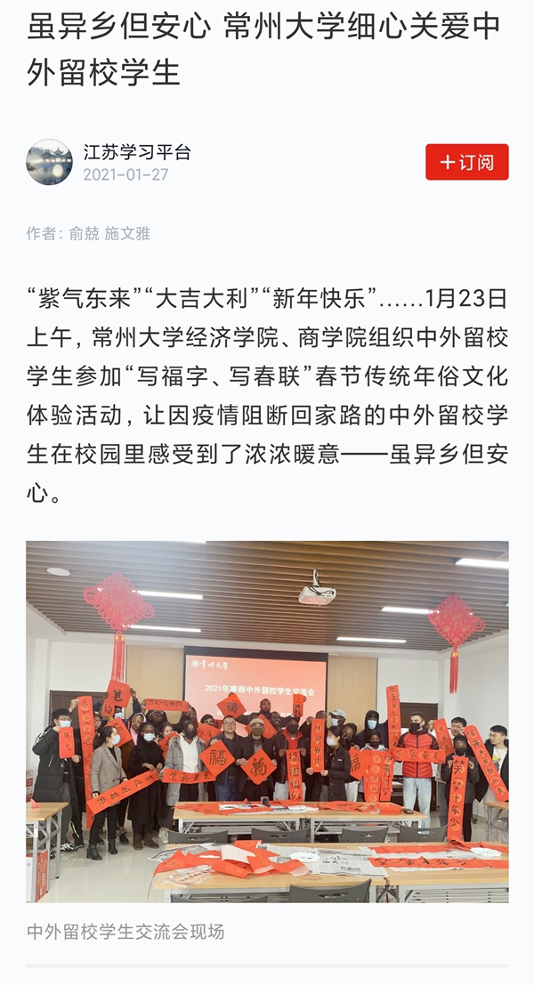 | 学习强国:虽异乡但安心 常州大学细心关爱中外留校学生 |