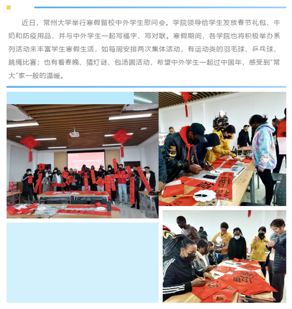 近日,常州大学举行寒假留校中外学生慰问会。学院领导给学生发放春节礼包、牛奶和防疫用品,并与中外学生一起写福字、写对联。寒假期间,各学院也将积极举办系列活动来丰富学生寒假生活,如每周安排两次集体活动,有运动类的羽毛球、乒乓球、跳绳比赛;也有看春晚、猜灯谜、包汤圆活动,希望中外学生一起过中国年,感受到“常大”家一般的温暖。 江苏教育发布(微信):https://mp.weixin.qq.com/s/zWlrT53mkRi6jI8VAbIbPQ (编辑:刘博) |