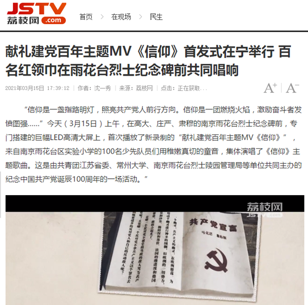 | 荔枝新闻:献礼建党百年主题MV《信仰》首发式在宁举行 百名红领巾在雨花台烈士纪念碑前共同唱响 |