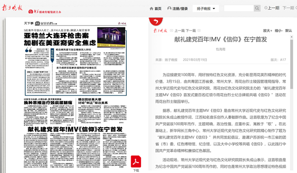 | 扬子晚报:献礼建党百年!MV《信仰》在宁首发 |