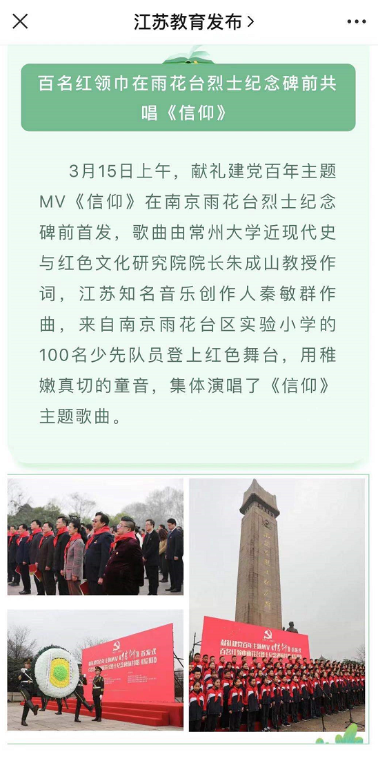 3月15日上午,献礼建党百年主题MV《信仰》在南京雨花台烈士纪念碑前首发,歌曲由常州大学近现代史与红色文化研究院院长朱成山教授作词,江苏知名音乐创作人秦敏群作曲,来自南京雨花台区实验小学的100名少先队员登上红色舞台,用稚嫩真切的童音,集体演唱了《信仰》主题歌曲。