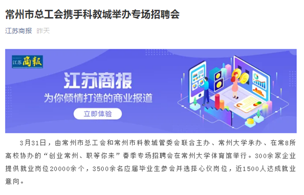 | 江苏商报(微信):常州市总工会携手科教城举办专场招聘会 |