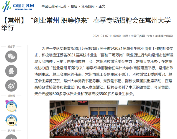 | 中国江苏网:“创业常州 职等你来”春季专场招聘会在常州大学举行 |