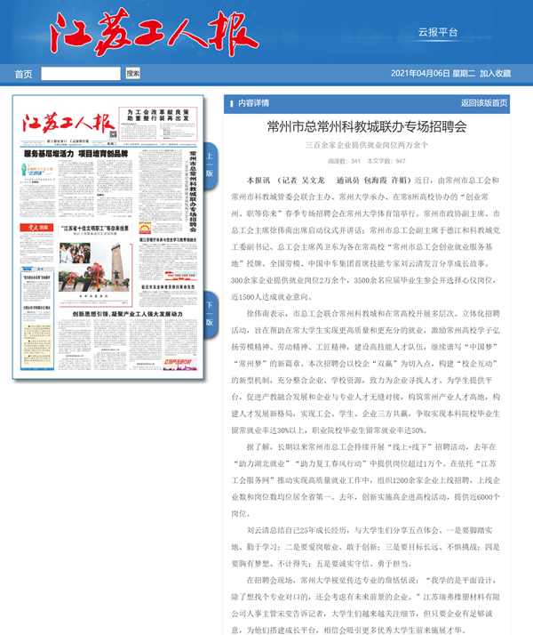 | 江苏工人报:常州市总常州科教城联办专场招聘会 |