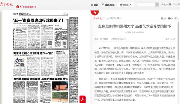 | 扬子晚报:红色歌剧唱响常州大学 高雅艺术涵养爱国情怀 |