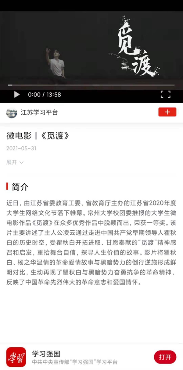 近日,由江苏省委教育工委、省教育厅主办的江苏省2020年度大学生网络文化节落下帷幕。常州大学校团委推报的大学生微电影作品《觅渡》在众多优秀作品中脱颖而出,荣获一等奖。该片主要讲述了主人公凌云通过走进中国共产党早期领导人瞿秋白的历史时空,受瞿秋白开拓进取、甘愿奉献的“觅渡”精神感召和启发,重拾舞台自信,探寻人生价值的故事。影片将瞿秋白、杨之华温情的革命爱情故事与黑暗势力的倒行逆施形成鲜明对比,生动再现了瞿秋白与黑暗势力奋勇抗争的革命精神,反映了中国革命先烈伟大的革命意志和爱国情怀。 学习强国:微电影丨《觅渡》 (编辑:刘博) |