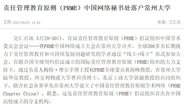 | 交汇点:责任管理教育原则(PRME)中国网络秘书处落户常州大学 |