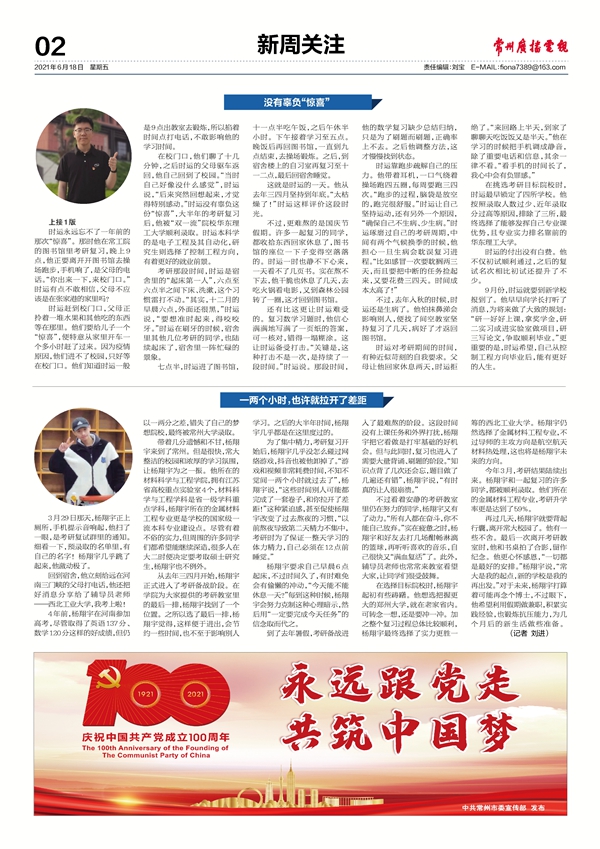 自律就能追上来 张水鑫最近在忙着参与筹备毕业晚会的事。作为即将毕业的学生会副主席,他想为大家再做些贡献,专门负责起了晚会的拍摄人员联系工作。提起另外一件事,他有些平淡,“那个啊,当时自己的目标订得高了些,没想到一下子就中了。”几个月前,他拿到了复旦大学硕士研究生的录取通知书,完成了一次人生跨越。 他是南京人,高考时本想上家门口的211院校,但最后的成绩略有差距,他综合考虑城市环境和学校实力,最后来到了常州大学。刚到大学时的张水鑫多少有些迷茫,大一那年甚至没拿到奖学金。到了大二,张水鑫重新审视自己,之后奋起直追,他开始拿二等奖学金、一等奖学金,再到大四考取复旦。“你自律一点就能追上来。”他总结道。 几年专业学习下来,张水鑫对新型材料方向越来越感兴趣,想通过考研进一步提升自己。他平时很喜欢关注时事,芯片技术卡脖子的问题,更是促使他选择半导体和芯片相关的研究方向。 张水鑫花了十几天时间来搜集考研院校资料,与专业老师、辅导员、学长们深入沟通,对意向院校和专业进行比对和挑选,最终确定了复旦大学。“会不会跨度有点太大?会很累的!”有朋友提醒他。张水鑫没有犹豫,“拼了!”他是个篮球迷,从上中学起就是球场的常客,下了球场,还时刻关注着篮球资讯。哪怕是紧张的考研复习期间,他也利用空隙时间刷着篮球方面的微博。张水鑫最喜欢的球星是詹姆斯,一位敢冲敢拼的著名前锋。张水鑫至今记得詹姆斯在场上的一幕,“很多人吊在他身上进行防守,但詹姆斯仍旧一人扣篮,最终成功。”这种拼搏精神影响着张水鑫。 为了争取复习时间,去年暑假的两个月时间,张水鑫一次也没回家,尽管常州南京之间的交通十分便捷。到了十一二月份的冲刺阶段,张水鑫更是把起床时间从六点多提前到了五点四十,成了宿舍里起得最早的人。这期间,因为压力过大,张水鑫嘴里发苦,一查是肠胃出现了问题,他吃过药后很快回到教室。 考研备战后期,专业课、时事政治材料、英语作文的复习堆到了一起,张水鑫一度觉得脑子是涨的。他感觉东西学不完,记不牢,有些焦虑。不过他处理焦虑的方式,不是和别人交流诉说,而是选择加倍努力。 打球也是他的解压方式之一。约几个同学打个半场,张水鑫在里面担任中锋,一场球下来让他放松不少。他也偶尔玩手机,但张水鑫不让自己碰游戏。对于游戏,张水鑫有种特别的感受:“要是打一局游戏,感觉大脑里装的知识会流失,真的。”实际上,他以前是风靡网络的游戏“王者荣耀”的钻石级玩家,因为要考研,他便卸载了软件,之后就很少碰过。 张水鑫把自己的复习地点选在了图书馆。那里更加安静,而且学校提供了空调设施,环境更加舒适。张水鑫每天提前一小时到图书馆,先在外面背一个小时的单词,再凭手机预约进入,找到预约好的座位开始学习。图书馆晚上9点关门,张水鑫再转战到三楼的专用教室复习至十一点回宿舍。复习的最后阶段,有同学选择在这里通宵自习,张水鑫怕身体吃不消,一直没尝试。但是同学们奋斗的身影,鼓舞着他。 最终被复旦录取,让张水鑫成为了同学中受关注的人,但他仍是平淡处之。在他看来,除了坚持和努力,好心态对这次成功更加重要。“曾有学妹看到我说,‘怎么每次见到你都是活力四射、蹦蹦跳跳的啊?!’其实,就是把心态一定要放平。” 不过,张水鑫也承认,这次考取复旦,是对自己的一次挑战。“年轻,无限可能!”他又调侃道:“我是不是有点‘逆袭’的感觉啊?” 对于马上到来的假期,张水鑫计划先到上海,去复旦的校园转一转。他希望自己将来能进入芯片行业,或是到国外继续深造,“毕竟,学无止境嘛!” 一两个小时,也许就拉开了差距 3月29日那天,杨翔宇正上厕所,手机提示音响起,他扫了一眼,是考研复试群里的通知。细看一下,预录取的名单里,有自己的名字!杨翔宇几乎跳了起来,他激动极了。 回到宿舍,他立刻给远在河南三门峡的父母打电话,他还把好消息分享给了辅导员老师——西北工业大学,我考上啦! 4年前,杨翔宇在河南参加高考,尽管取得了英语137分、数学120分这样的好成绩,但仍以一两分之差,错失了自己的梦想院校,最终被常州大学录取。 带着几分遗憾和不甘,杨翔宇来到了常州。但是很快,常大整洁的校园和浓厚的学习氛围,让杨翔宇为之一振。他所在的材料科学与工程学院,拥有江苏省高校重点实验室4个,材料科学与工程学科是省一级学科重点学科,杨翔宇所在的金属材料工程专业更是学校的国家级一流本科专业建设点。尽管有着不俗的实力,但周围的许多同学们都希望能继续深造,很多人在大二时便决定要考取硕士研究生,杨翔宇也不例外。 从去年三四月开始,杨翔宇正式进入了考研备战阶段。在学院为大家提供的考研教室里的最后一排,杨翔宇找到了一个位置。之所以选了最后一排,杨翔宇觉得,这样便于进出,会节约一些时间,也不至于影响别人学习。之后的大半年时间,杨翔宇几乎都是在这里度过的。 为了集中精力,考研复习开始后,杨翔宇几乎没怎么碰过网络游戏,抖音也被他卸掉了。“游戏和视频非常耗费时间,不知不觉间一两个小时就过去了”,杨翔宇说,“这些时间别人可能都完成了一套卷子,和你拉开了差距!”这种紧迫感,甚至促使杨翔宇改变了过去熬夜的习惯,“以前熬夜导致第二天精力不集中,考