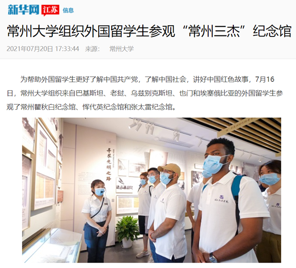 | 新华网:常州大学组织外国留学生参观“常州三杰”纪念馆 |