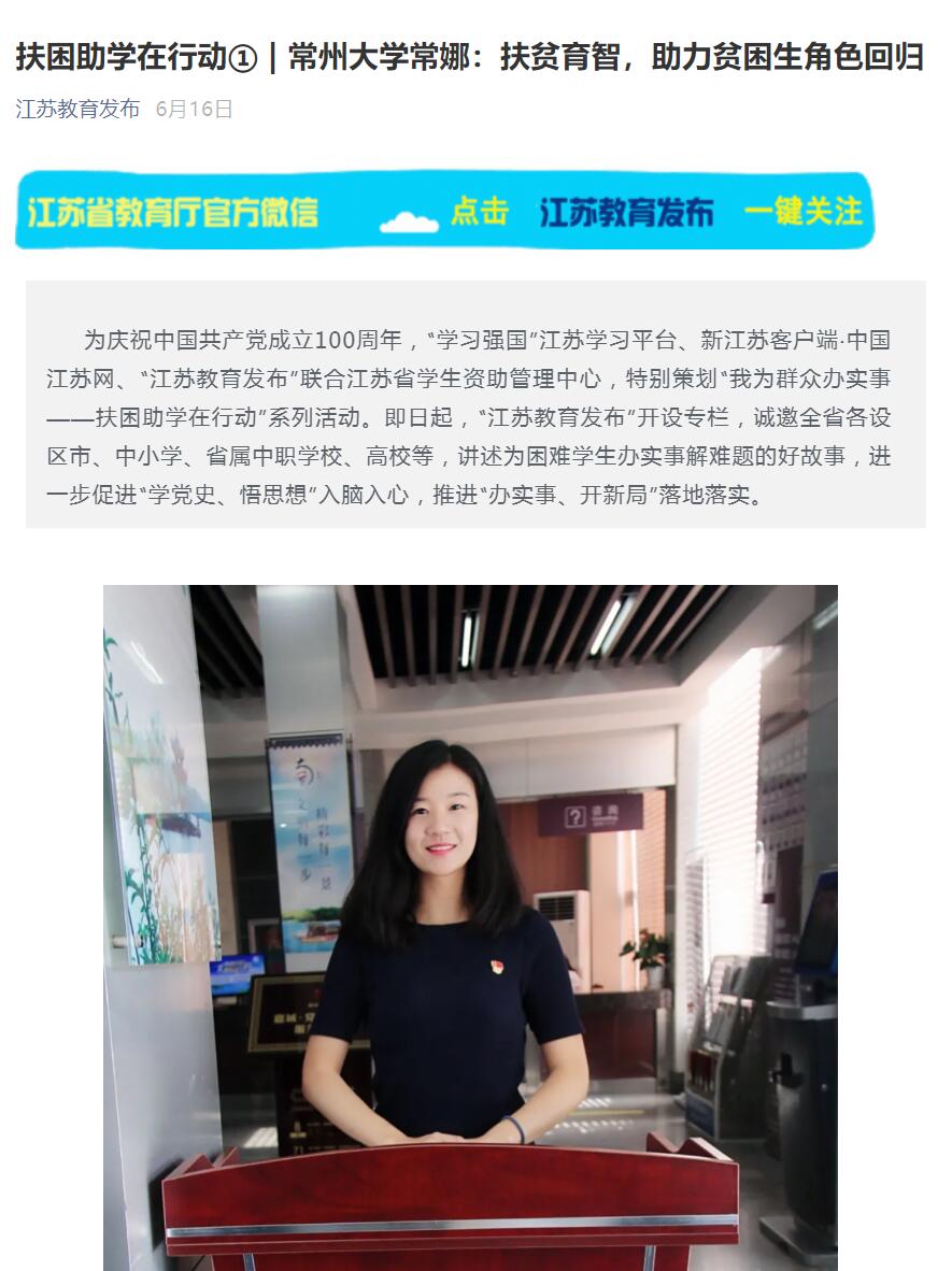 | 江苏教育发布(微信):扶困助学在行动① | 常州大学常娜:扶贫育智,助力贫困生角色回归 |