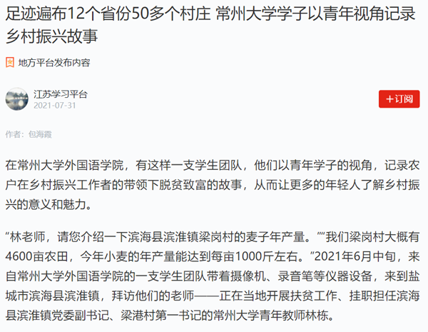 | 学习强国:足迹遍布12个省份50多个村庄 常州大学学子以青年视角记录乡村振兴故事 |