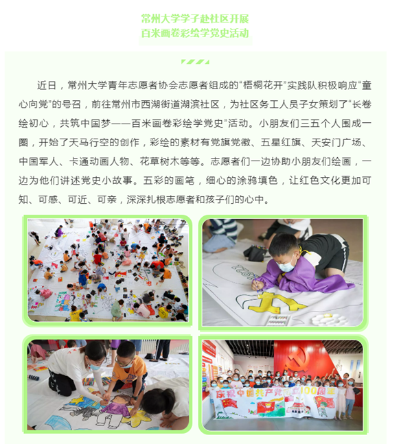 常州大学学子赴社区开展百米画卷彩绘学党史活动 近日,常州大学青年志愿者协会志愿者组成的“梧桐花开”实践队积极响应“童心向党”的号召,前往常州市西湖街道湖滨社区,为社区务工人员子女策划了“长卷绘初心,共筑中国梦——百米画卷彩绘学党史”活动。小朋友们三五个人围成一圈,开始了天马行空的创作,彩绘的素材有党旗党徽、五星红旗、天安门广场、中国军人、卡通动画人物、花草树木等等。志愿者们一边协助小朋友们绘画,一边为他们讲述党史小故事。五彩的画笔,细心的涂鸦填色,让红色文化更加可知、可感、可近、可亲,深深扎根志愿者和孩子们的心中。 江苏教育发布(微信):https://mp.weixin.qq.com/s/PX7B-Ri_eh7Nnjbr016EPA (编辑:刘博) |