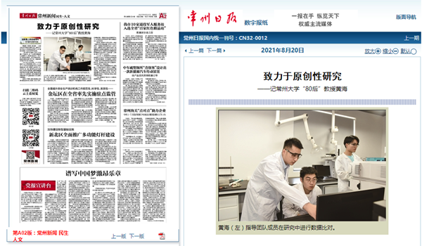| 常州日报:致力于原创性研究 ——记常州大学“80后”教授黄海 |