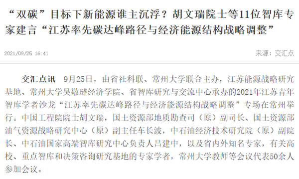 | 交汇点:“双碳”目标下新能源谁主沉浮?胡文瑞院士等11位智库专家建言“江苏率先碳达峰路径与经济能源结构战略调整” |