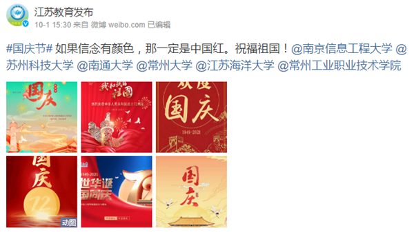 江苏教育发布(微博):#国庆节# 如果信念有颜色,那一定是中国红。祝福祖国!