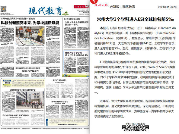 | 常州日报:常州大学3个学科进入ESI全球排名前5‰ |