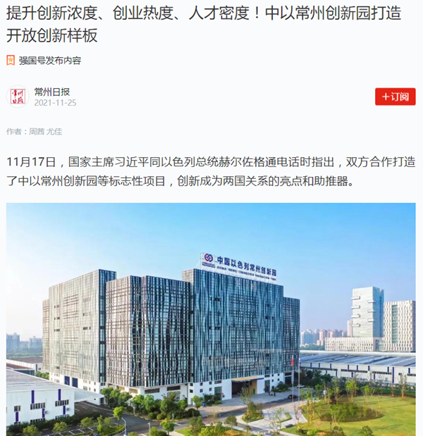 | 学习强国:提升创新浓度、创业热度、人才密度!中以常州创新园打造开放创新样板 |