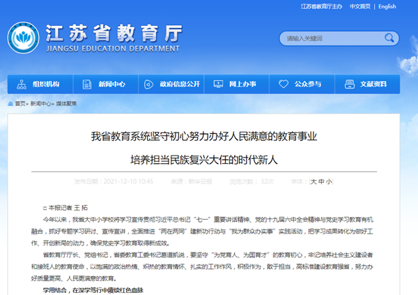 | 江苏教育网:我省教育系统坚守初心努力办好人民满意的教育事业 培养担当民族复兴大任的时代新人 |