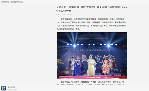 | 常州新闻:天地有节,霓裳有情 | 常州大学举行第十四届“风舞霓裳”环保服饰设计大赛 |