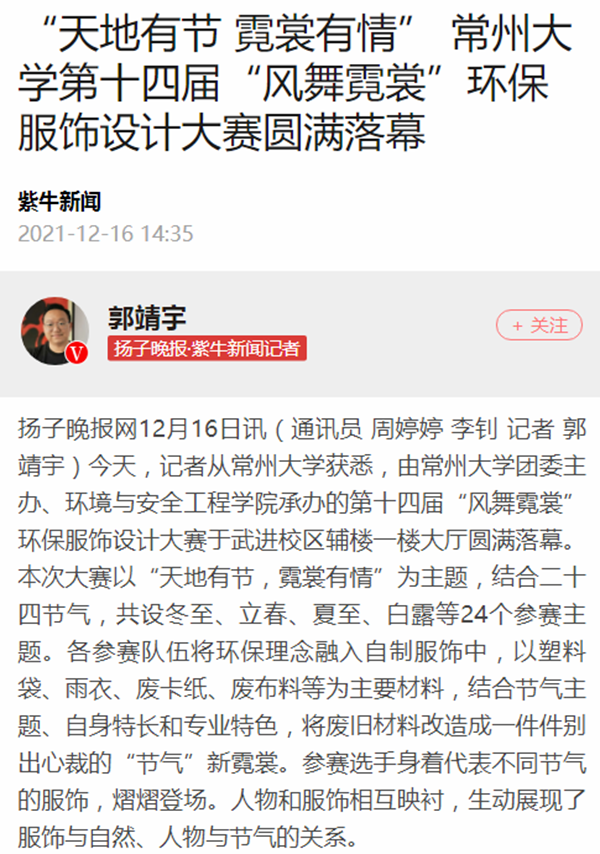 | 紫牛新闻:“天地有节 霓裳有情” 常州大学第十四届“风舞霓裳”环保服饰设计大赛圆满落幕 |
