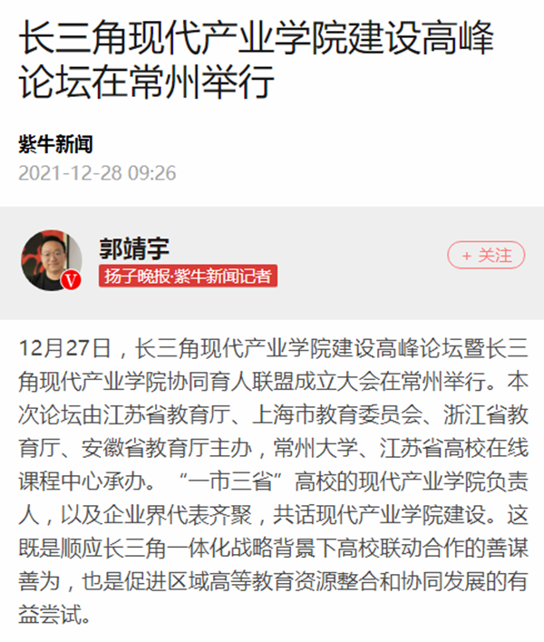 | 紫牛新闻:长三角现代产业学院建设高峰论坛在常州举行 |