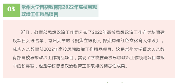 常州大学首获教育部2022年高校思想政治工作精品项目 近日,教育部思想政治工作司公布了2022年高校思想政治工作有关培育建设项目入选名单,常州大学的《聚焦立德树人 探索构建红色文化育人体系》,成功入选教育部2022年高校思想政治工作精品项目。这是常州大学首次入选教育部高校思想政治工作精品项目,实现了学校在高校思想政治工作领域项目申报中的新突破,也是学校思想政治教育工作取得的标志性成果。 江苏教育发布(微信):https://mp.weixin.qq.com/s/sY0z3lpT_2rR6Llis8qGyw (编辑:刘博) |