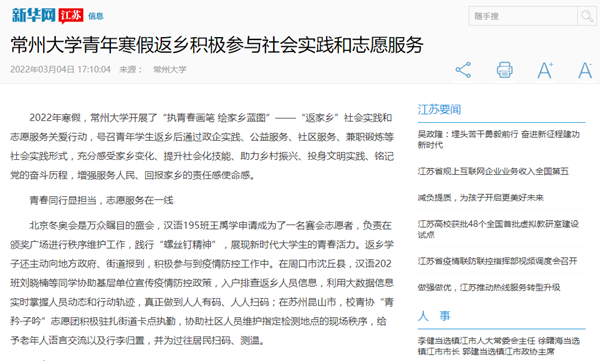 | 新华网:常州大学青年寒假返乡积极参与社会实践和志愿服务 |