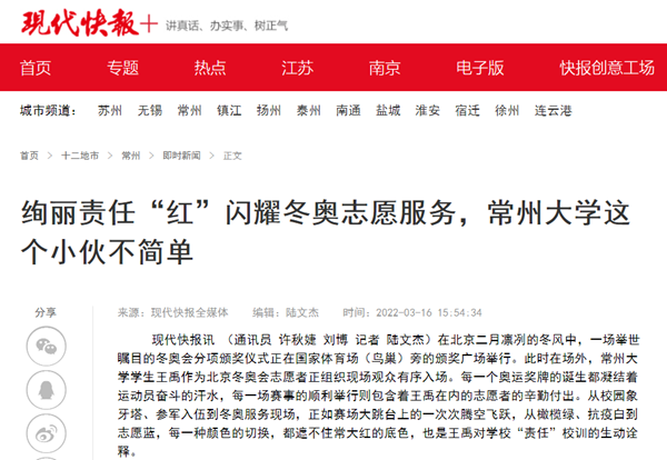 | 现代快报:绚丽责任“红”闪耀冬奥志愿服务,常州大学这个小伙不简单 |