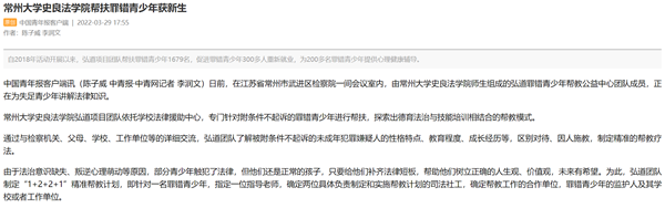 | 中国青年报客户端:常州大学史良法学院帮扶罪错青少年获新生 |