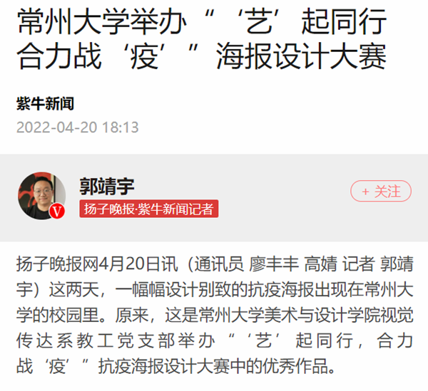 | 紫牛新闻:常州大学举办“‘艺’起同行 合力战‘疫’”海报设计大赛 |