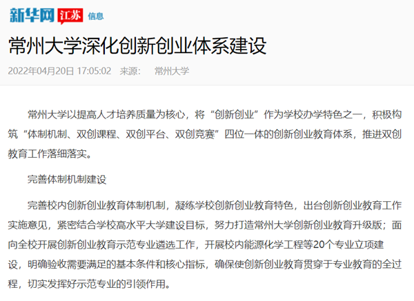 | 新华网:常州大学深化创新创业体系建设 |