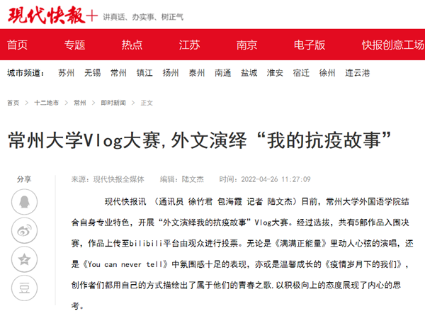 | 现代快报网:常州大学Vlog大赛,外文演绎“我的抗疫故事” |