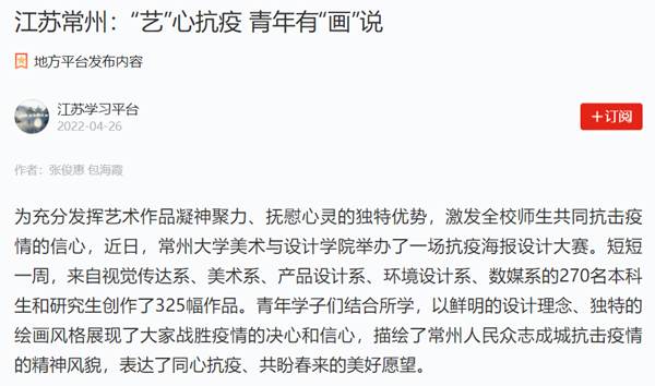 学习强国:江苏常州——“艺”心抗疫 青年有“画”说 (编辑:刘博) |