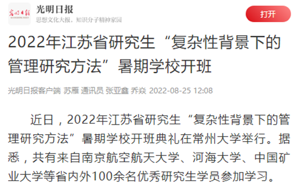 | 光明日报客户端:2022年江苏省研究生“复杂性背景下的管理研究方法”暑期学校开班 |
