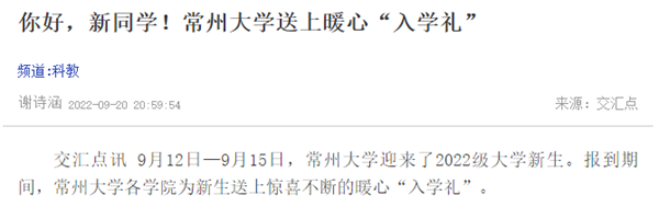 | 交汇点:你好,新同学!常州大学送上暖心“入学礼” |