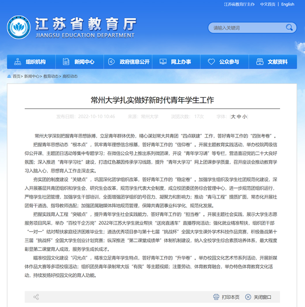 | 江苏教育网:常州大学扎实做好新时代青年学生工作 |