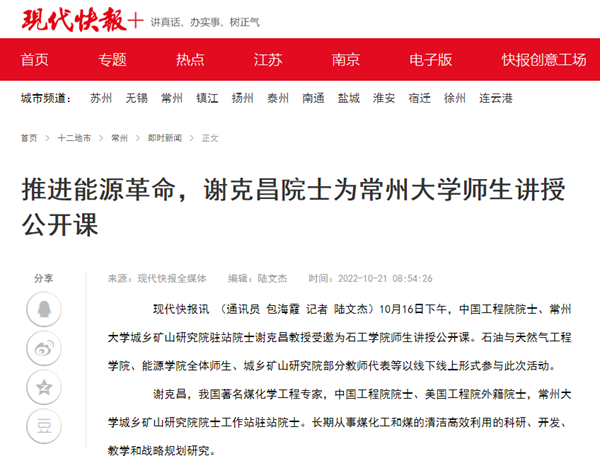 | 现代快报网:推进能源革命,谢克昌院士为常州大学师生讲授公开课 |