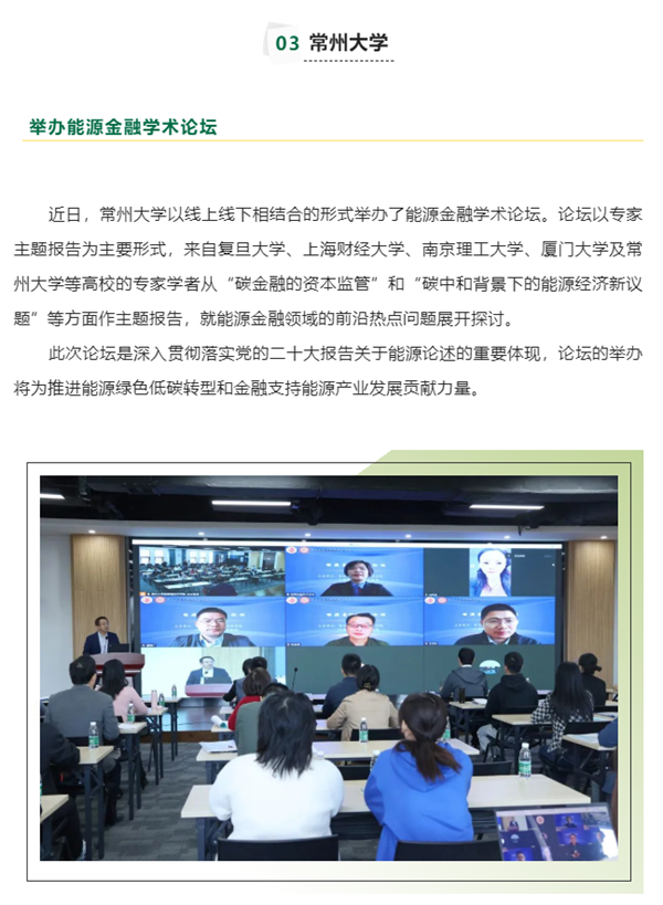 举办能源金融学术论坛 近日,常州大学以线上线下相结合的形式举办了能源金融学术论坛。论坛以专家主题报告为主要形式,来自复旦大学、上海财经大学、南京理工大学、厦门大学及常州大学等高校的专家学者从“碳金融的资本监管”和“碳中和背景下的能源经济新议题”等方面作主题报告,就能源金融领域的前沿热点问题展开探讨。 此次论坛是深入贯彻落实党的二十大报告关于能源论述的重要体现,论坛的举办将为推进能源绿色低碳转型和金融支持能源产业发展贡献力量。 江苏教育发布(微信):https://mp.weixin.qq.com/s/NH0B3xkWXdbc18yI8SJVhA (编辑:刘博) |