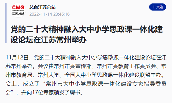 | 央视新闻:党的二十大精神融入大中小学思政课一体化建设论坛在江苏常州举办 |