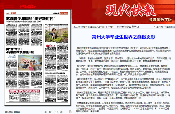 | 现代快报:常州大学毕业生世界之巅做贡献 |