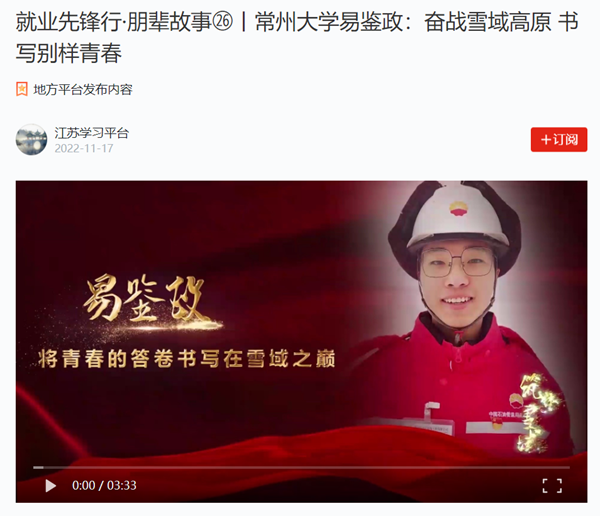 | 学习强国:就业先锋行·朋辈故事㉖丨常州大学易鉴政:奋战雪域高原 书写别样青春 |