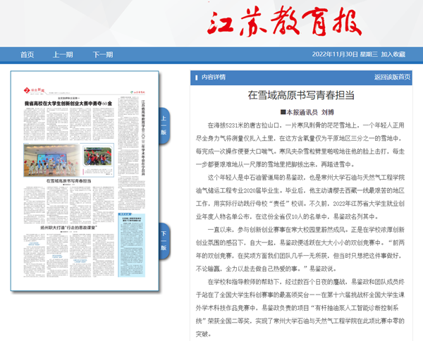 在海拔5231米的唐古拉山口,一片寒风刺骨的茫茫雪地上,一个年轻人正用尽全身力气将测量仪扎入土里,在这方含氧量仅为平原地区三分之一的雪地中,每完成一次操作便要大口喘气。寒风夹杂雪粒劈里啪啦地往他的脸上击打,每走一步都要艰难地从一尺厚的雪地里把脚拔出来,再踏进雪中。 这个年轻人是中石油管道局的易鉴政,也是常州大学石油与天然气工程学院油气储运工程专业2020届毕业生。毕业后,他主动请缨去西藏一线最艰苦的地区工作,用实际行动践行母校“责任”校训。不久前,2022年江苏省大学生就业创业年度人物名单公布,在这份全省仅10人的名单中,易鉴政名列其中。 一直以来,参与创新创业赛事在常大校园里蔚然成风。正是在学校浓厚创新创业氛围的感召下,自大一起,易鉴政便活跃在大大小小的双创竞赛中。“前两年的双创竞赛,在奖项方面我们团队几乎一无所获,但当时只想把这件事做好,不论输赢,全力以赴去做自己热爱的事。”易鉴政说。 在学校和指导教师的帮助下,经过数百个日夜的鏖战,易鉴政和团队成员终于站在了全国大学生科创赛事的最高领奖台——在第十六届挑战杯全国大学生课外学术科技作品竞赛中,易鉴政负责的项目“有杆抽油泵人工智能诊断控制系统”荣获全国二等奖,实现了常州大学石油与天然气工程学院在此项比赛中零的突破。 “大学4年里,他经常通宵达旦地和同学泡在实验室里研究课题。他还以学院科协主席的身份,号召同学们一起参与科研创新项目比赛,从项目发起、组织到宣传、比赛,每个环节都离不开他的付出。”易鉴政所在学院辅导员魏锦扬感慨地说。 2020年6月,易鉴政凭借大学期间的优异成绩被中石油管道局录取,分配到江苏省徐州分公司工作。当年7月,习近平总书记在给中国石油大学(北京)克拉玛依校区毕业生的回信中,肯定他们到边疆基层工作的选择,并对广大高校毕业生提出殷切期望。看到这一报道,易鉴政内心久久不能平静。 “当时正值入职培训,领导介绍了公司在西藏建设的国防战略项目。得知这一难得机会,我主动找到领导,表达了想要参与该项目的强烈意愿。”易鉴政回忆说。在和家人进行充分沟通后,他终于赢得了父母的支持,义无反顾地踏上了援藏之行,成了该项目最年轻的职工。 工作第一站便是驻扎在世界上海拔最高的兵站——唐古拉山兵站。海拔5000余米的唐古拉山被誉为人类的“生命禁区”,早上下雪,中午狂风,下午曝晒,傍晚冰雹,一日四季,全年平均气温仅零下4℃,还有低达零下45℃的极寒天气。在这里,大声说话和快步走路造成的窒息感,会让心肺剧痛,难以动弹,驻扎的兵站附近还常有凶猛野熊和野狼出没…… 易鉴政没有放弃。他主动负责极为艰苦的测量工作,两年来累计徒步踏勘190余公里,测量翻越海拔5279米的雪山,走遍了项目所在的雪山、沟壑、沼泽。他还在工作之余查阅相关工程论文、技术工法和国标规范,与同事通力合作,大胆创新,撰写了单项穿越施工方案、地下关键障碍物穿越方案,并在现场蹲守数小时验证方案可行性。最终,这些方案被证实大大降低了施工风险和成本。 入职两年多来,易鉴政荣获“全国大学生基层就业人物”“管道局‘十三五期间’优秀新员工”“CPNG工程攻坚标兵”和“CPNG工程青年岗位能手”等荣誉称号。援藏项目进入完工阶段,易鉴政选择继续留在西藏,长期支援边疆建设。 “上学期间,母校韦忠良教授的‘铁人’事迹一直在学生中广为流传。他把所有精力都放在了攻坚科研、人才培养上,研制出超硬地层钻头,创造出多项行业记录,用言传身教为学生树起了一座‘让人生过得更加富有意义’的航向标,我觉得人生当如此。”易鉴政说。 江苏教育报:http://epaper.jsenews.com/Article/index/aid/7190460.html (编辑:刘博) |