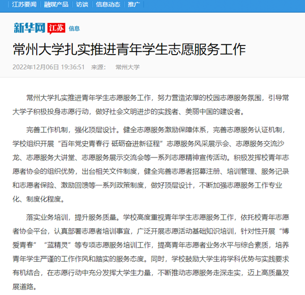 | 新华网:常州大学扎实推进青年学生志愿服务工作 |